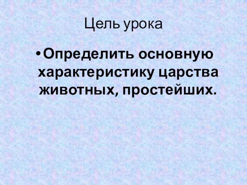 Цель урокаОпределить основную характеристику царства животных, простейших.