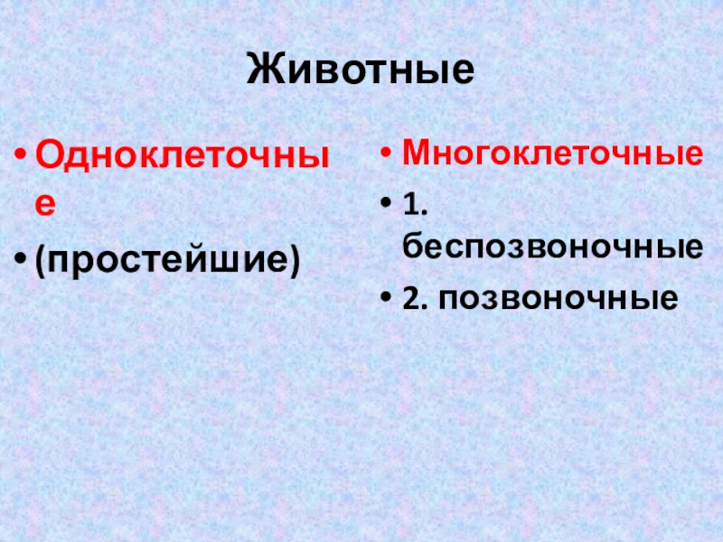 ЖивотныеОдноклеточные(простейшие)Многоклеточные1. беспозвоночные2. позвоночные