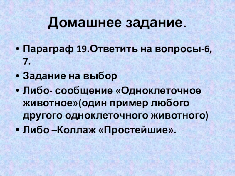 Домашнее задание.Параграф 19.Ответить на вопросы-6, 7. Задание на выборЛибо- сообщение «Одноклеточное животное»(один пример любого другого одноклеточного животного)Либо