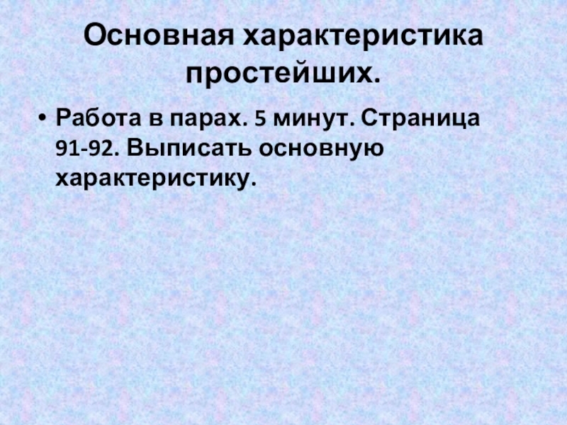Основная характеристика простейших.Работа в парах. 5 минут. Страница 91-92. Выписать основную характеристику.
