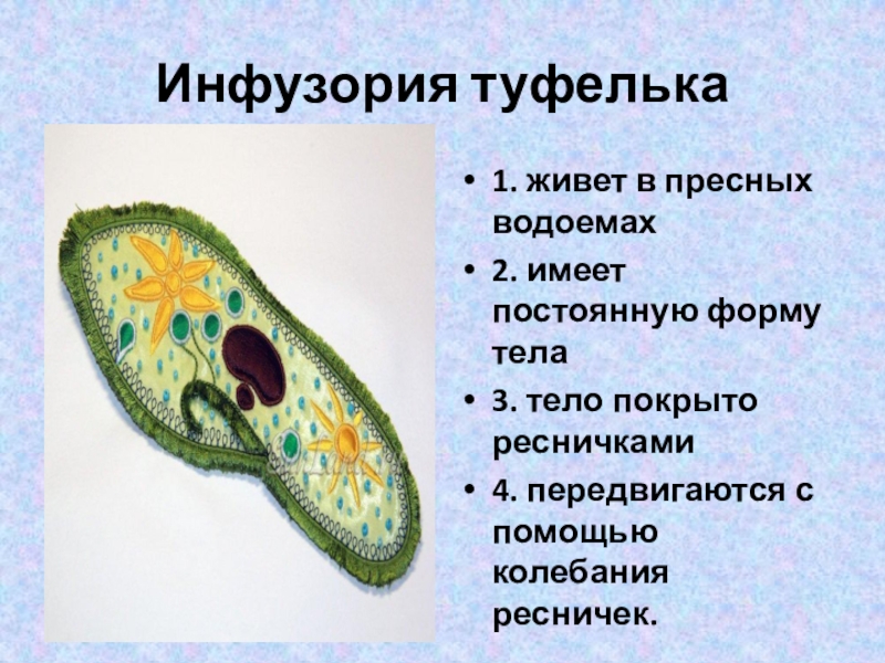 Инфузория туфелька1. живет в пресных водоемах2. имеет постоянную форму тела3. тело покрыто ресничками4. передвигаются с помощью колебания