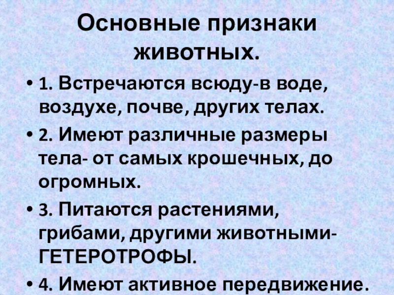 Основные признаки животных.1. Встречаются всюду-в воде, воздухе, почве, других телах.2. Имеют различные размеры тела- от самых крошечных,