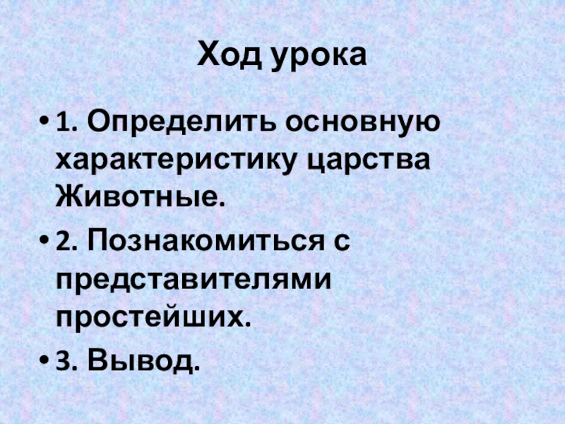 Ход урока1. Определить основную характеристику царства Животные.2. Познакомиться с представителями простейших.3. Вывод.
