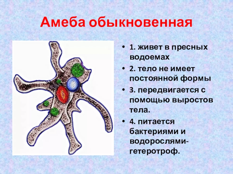 Амеба обыкновенная1. живет в пресных водоемах2. тело не имеет постоянной формы3. передвигается с помощью выростов тела.4. питается