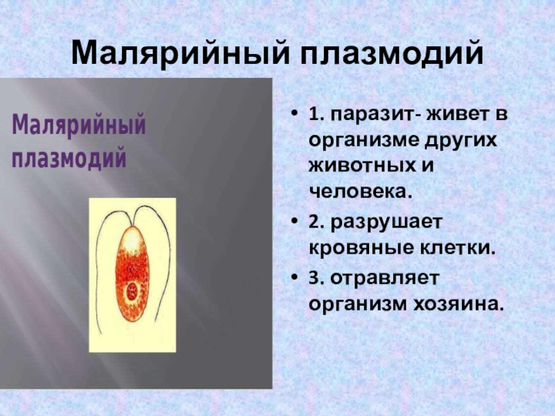 Малярийный плазмодий1. паразит- живет в организме других животных и человека.2. разрушает кровяные клетки.3. отравляет организм хозяина.