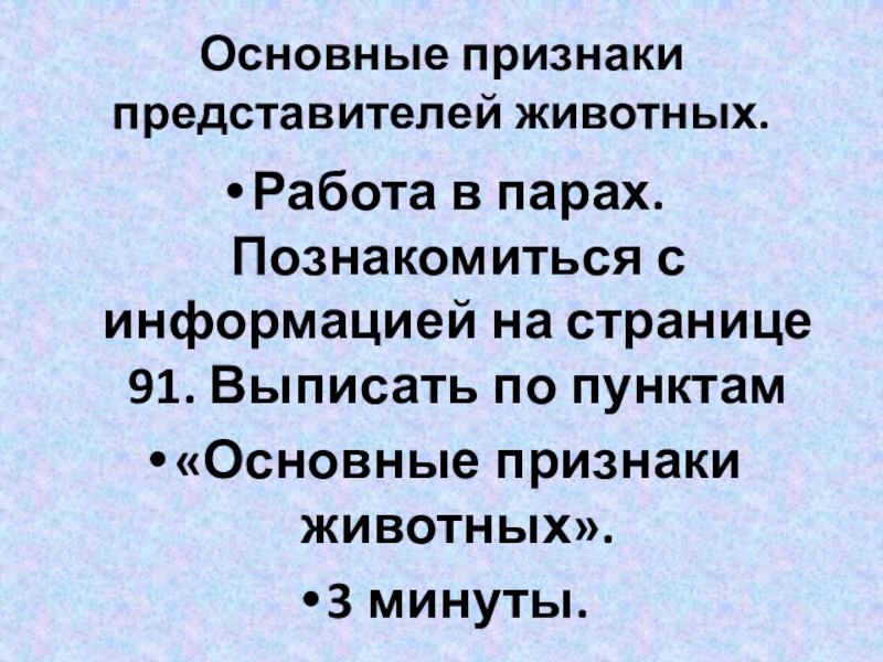 Основные признаки представителей животных.Работа в парах. Познакомиться с информацией на странице 91. Выписать по пунктам «Основные признаки