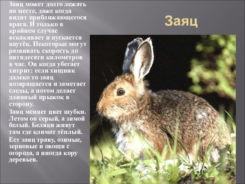 Заяц может долго лежать на месте, даже когда видит приближающегося врага. И только в крайнем случае вскакивает и пускается наутёк. Некоторые могут развивать скорость до пятидесяти километров в час. Он когда убегает хитрит: если хищник далеко то заяц возвращается и заметает следы, а потом делает длинный прыжок в сторону.