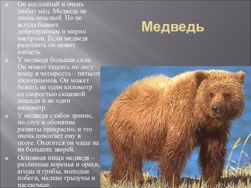 Он косолапый и очень любит мёд. Медведь не очень опасный. Но не всегда бывает добродушным и мирно настроен. Если медведя разозлить он может напасть.
