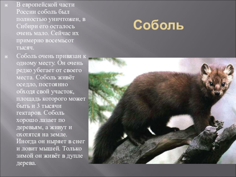 Тело у неё стройное, сильное, хвост длинный, мех пушистый, густой и очень красивый, тёмно-бурого цвета. А на горле и груди ещё и желтовато-белое пятно.