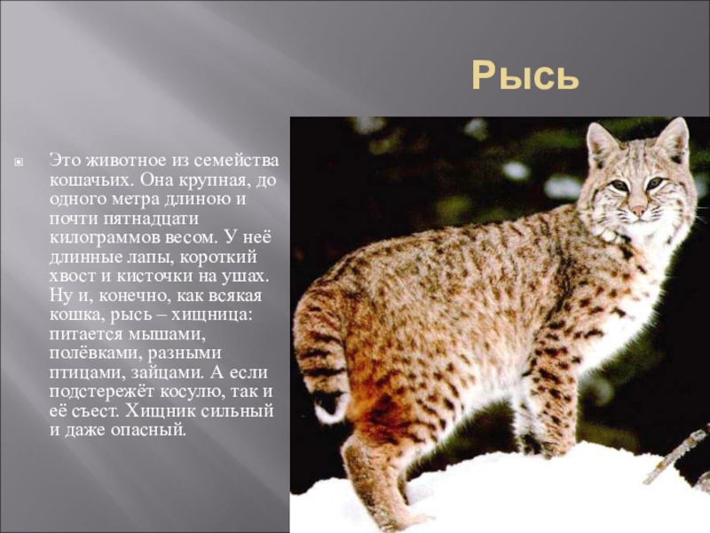 Это животное из семейства кошачьих. Она крупная, до одного метра длиною и почти пятнадцати килограммов весом. У неё длинные лапы, короткий хвост и кисточки на ушах. Ну и, конечно, как всякая кошка, рысь – хищница: питается мышами, полёвками, разными птицами, зайцами. А если подстережёт косулю, так и её съест. Хищник сильный и даже опасный.