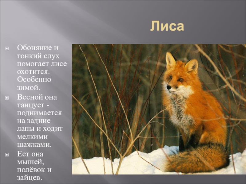 Обоняние и тонкий слух помогает лисе охотится. Особенно зимой.