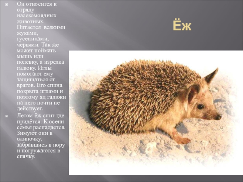 Он относится к отряду насекомоядных животных. Питается всякими жуками, гусеницами, червями. Так же может поймать мышь или полёвку, а изредка гадюку. Иглы помогают ему защищаться от врагов. Его спина покрыта иглами и поэтому яд гадюки на него почти не действует.