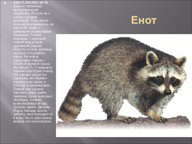 ЕНОТ-ПОЛОСКУН один из типичных представителей семейства. Ростом он с собаку средней величины. Тело енота - полоскуна коренастое, на коротких лапах с длинными подвижными пальцами. Голова широкая, с короткой тонкой мордочкой, крупными ушами. Шерсть густая, длинная, окраска ее буровато-серая. На морде характерна черная с белой оторочкой маска. На хвосте 5—7 широких черных или бурых колец. Он хорошо лазает по деревьям, но обычно кормится на земле, в болотах и мелководьях. Пищей ему служат лягушки, раки, рыба, грызуны (даже молодые ондатры), а также всевозможные ягоды, желуди, орехи, фрукты. Перед тем как съесть добычу, енот полощет ее в воде, что и дало повод назвать его полоскуном.