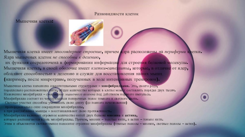 Мышечная клетка наполнена сократительными структурами – миофибриллами. Это, своего рода,