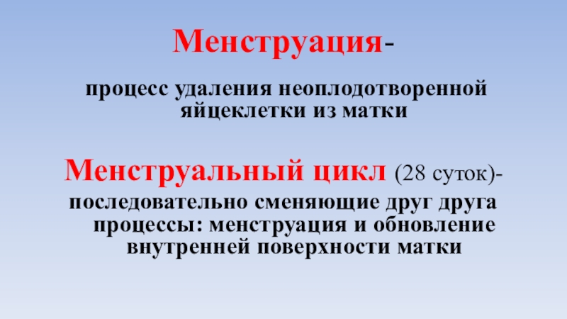 Менструация- процесс удаления неоплодотворенной яйцеклетки из маткиМенструальный цикл (28 суток)-последовательно сменяющие друг друга процессы: менструация и обновление