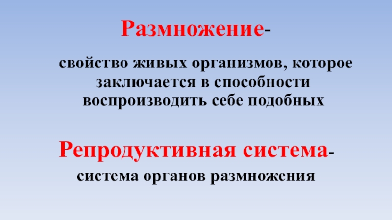 Размножение-	свойство живых организмов, которое заключается в способности воспроизводить себе подобныхРепродуктивная система-система органов размножения
