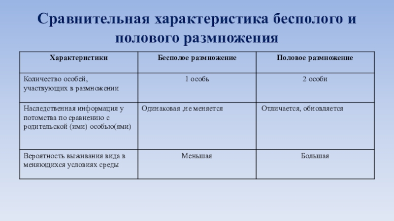 Слайд 4Сравнительная характеристика бесполого и полового размножения