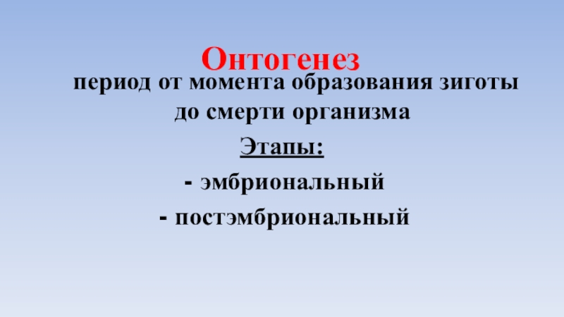 Онтогенез период от момента образования зиготы до смерти организмаЭтапы:эмбриональныйпостэмбриональный