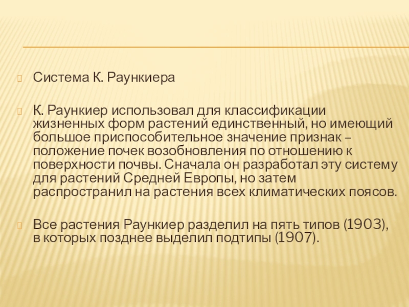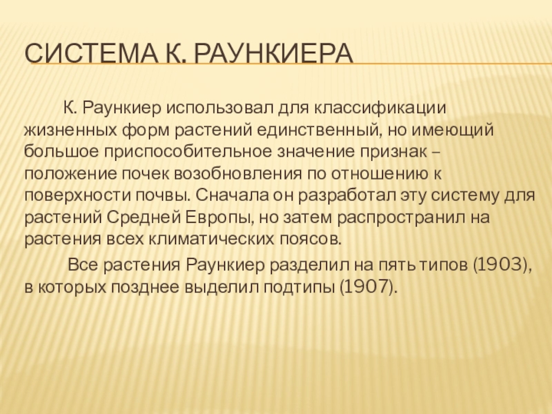 классификации жизненных форм растений единственный, но имеющий большое приспособительное значение признак – положение почек возобновления по отношению к поверхности почвы. Сначала он разработал эту систему для растений Средней Европы, но затем распространил на растения всех климатических поясов.