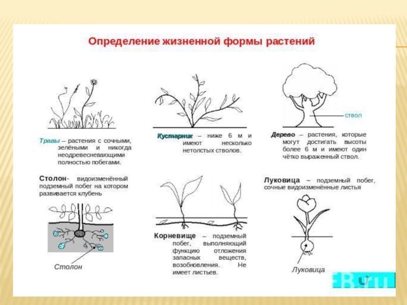 Жизненная форма – это своеобразная внешняя форма организмов, обусловленная биологией развития и внутренней структурой их органов, формируется в определенных поч-венно-климатических условиях, как приспособление жизни к этоим условиям