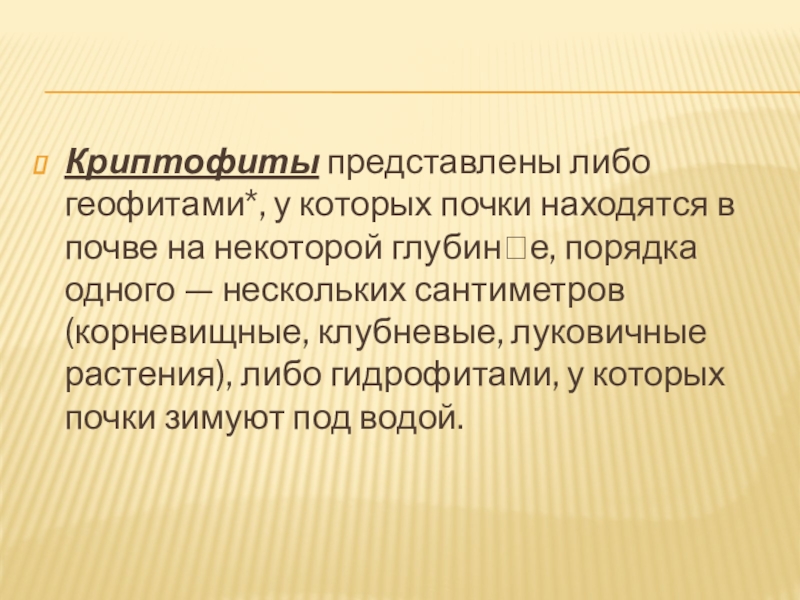 Слайд 11Криптофиты представлены либо геофитами*, у которых почки находятся в почве на