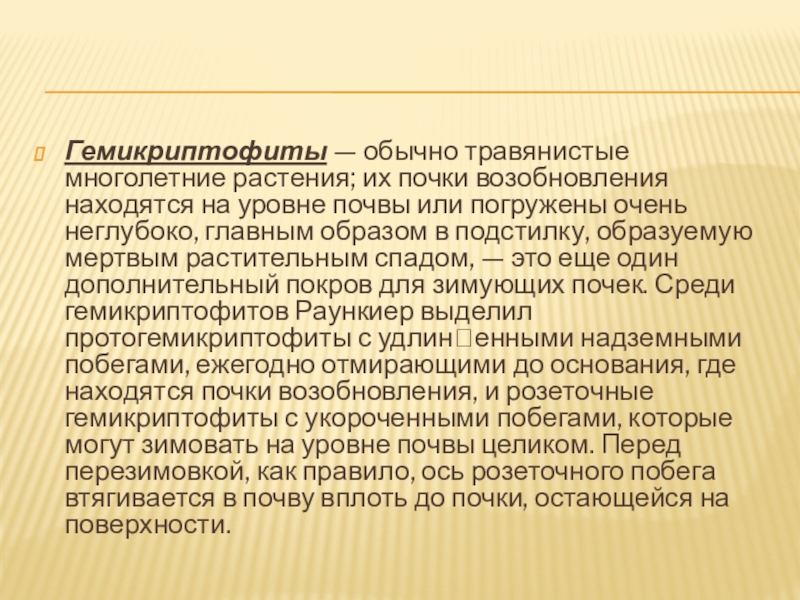 уровне почвы или погружены очень неглубоко, главным образом в подстилку, образуемую мертвым растительным спадом, — это еще один дополнительный покров для зимующих почек. Среди гемикриптофитов Раункиер выделил протогемикриптофиты с удлиненными надземными побегами, ежегодно отмирающими до основания, где находятся почки возобновления, и розеточные гемикриптофиты с укороченными побегами, которые могут зимовать на уровне почвы целиком. Перед перезимовкой, как правило, ось розеточного побега втягивается в почву вплоть до почки, остающейся на поверхности.
