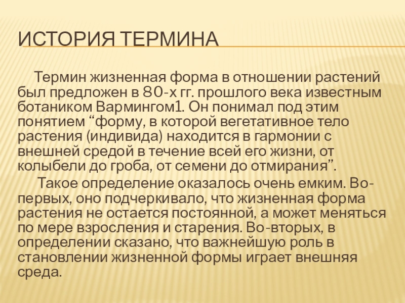 предложен в 80-х гг. прошлого века известным ботаником Вармингом1. Он понимал под этим понятием “форму, в которой вегетативное тело растения (индивида) находится в гармонии с внешней средой в течение всей его жизни, от колыбели до гроба, от семени до отмирания”.