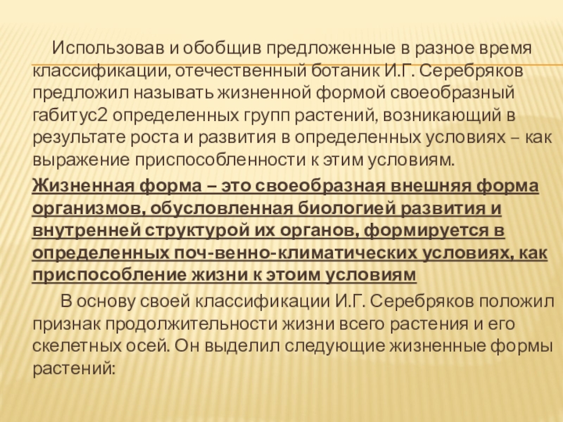 В основу своей классификации И.Г. Серебряков положил признак продолжительности жизни всего растения и его скелетных осей. Он выделил следующие жизненные формы растений: