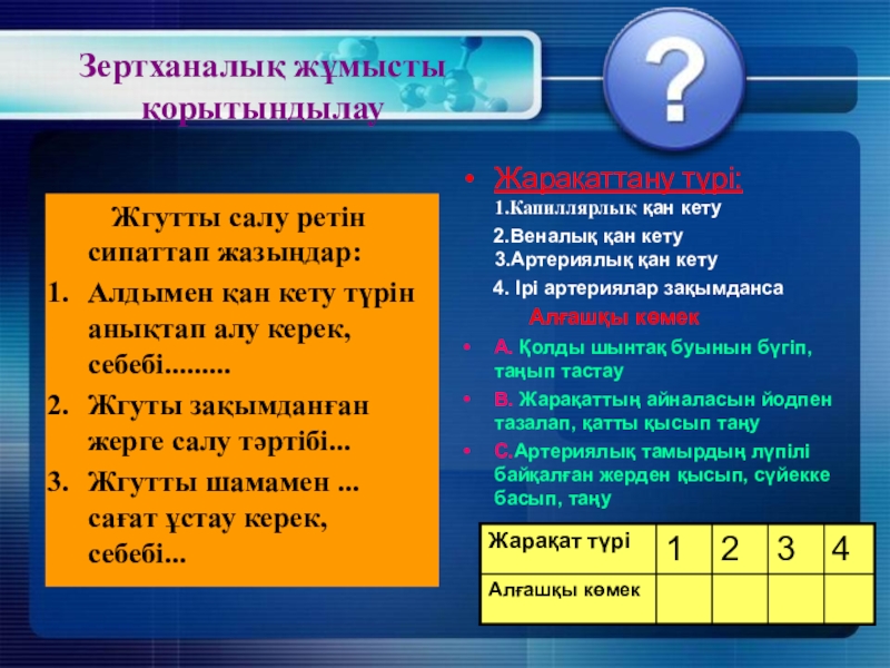 2. Артериялық, веналық және капиллярлық қан кету кезіндегі қанды тоқтату әрекеттерін түсіндіру