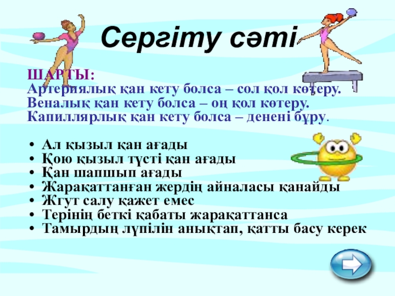 Сергіту сәтіШАРТЫ:Артериялық қан кету болса – сол қол көтеру.Веналық қан кету болса – оң қол көтеру.Капиллярлық қан