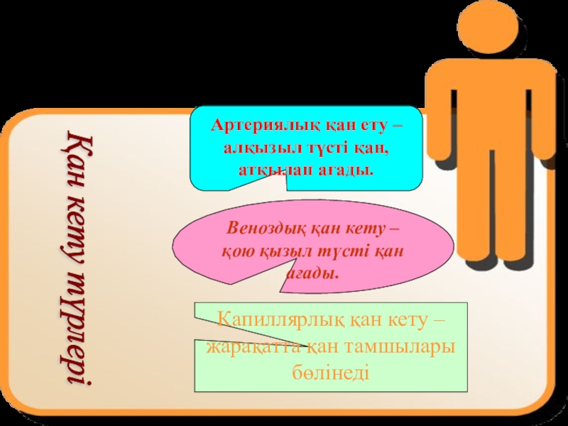 Қан кету түрлеріАртериялық қан ету – алқызыл түсті қан, атқылап ағады.Веноздық қан кету – қою қызыл түсті