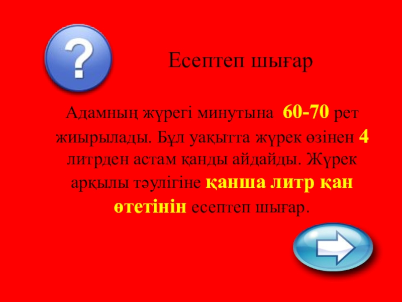 4 литрден астам қанды айдайды. Жүрек арқылы тәулігіне қанша литр қан өтетінін есептеп шығар.