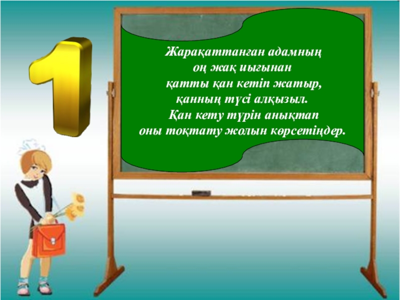 Баланың тізесі жарақаттанған. Қан тамшылап ағуда. Зақымданған жері ластанған. Қан кеті түрін анықтап, алғашқы көмек шараларын жаса.