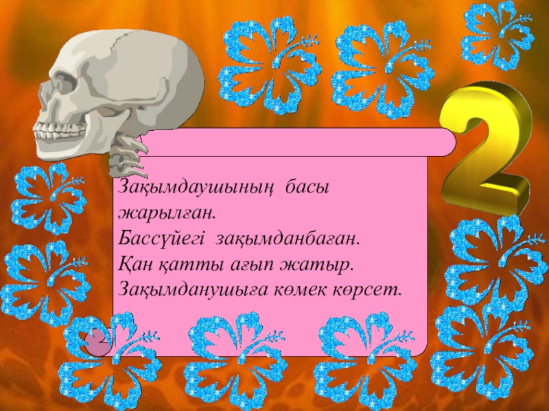 Зақымдаушының басы жарылған.Бассүйегі зақымданбаған. Қан қатты ағып жатыр. Зақымданушыға көмек көрсет.