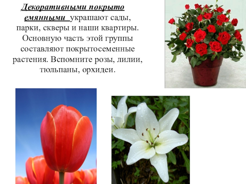 Декоративными покрыто емянными украшают сады, парки, скверы и наши квартиры. Основную часть этой группы составляют покрытосеменные растения.