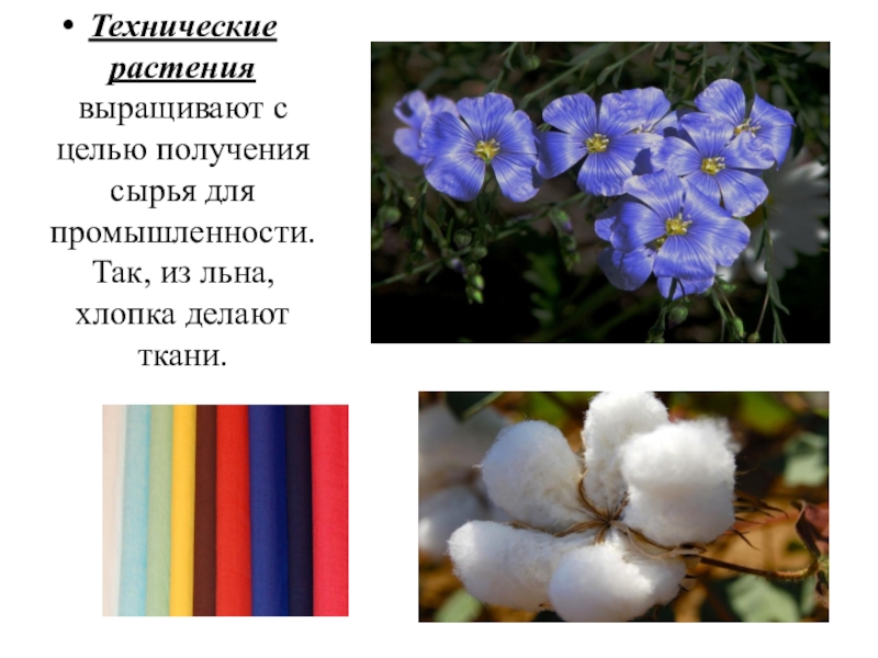 Технические растения выращивают с целью получения сырья для промышленности. Так, из льна, хлопка делают ткани.