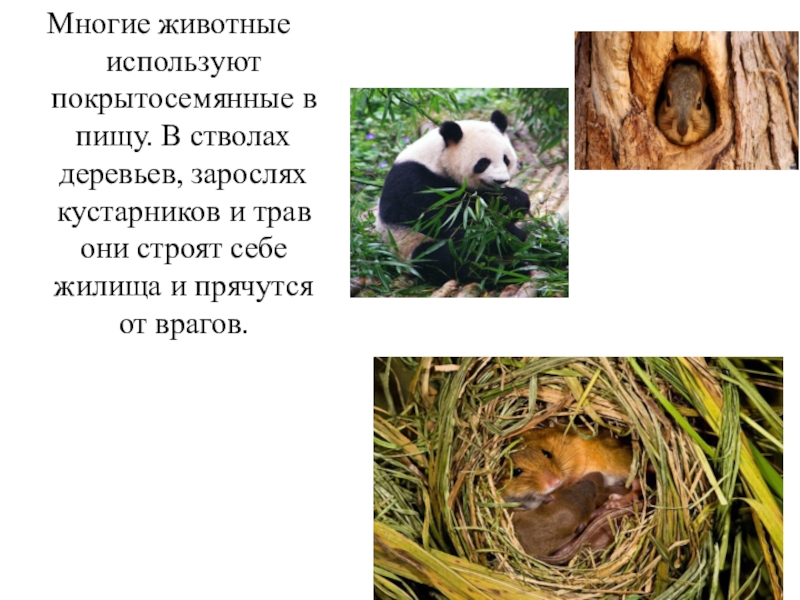 Слайд 5Многие животные используют покрытосемянные в пищу. В стволах деревьев, зарослях кустарников