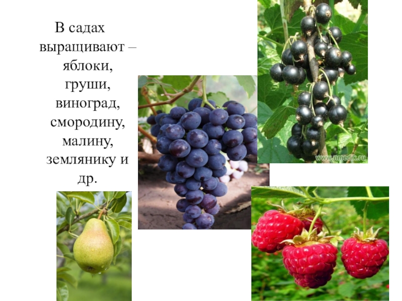 Слайд 10В садах выращивают – яблоки, груши, виноград, смородину, малину, землянику и