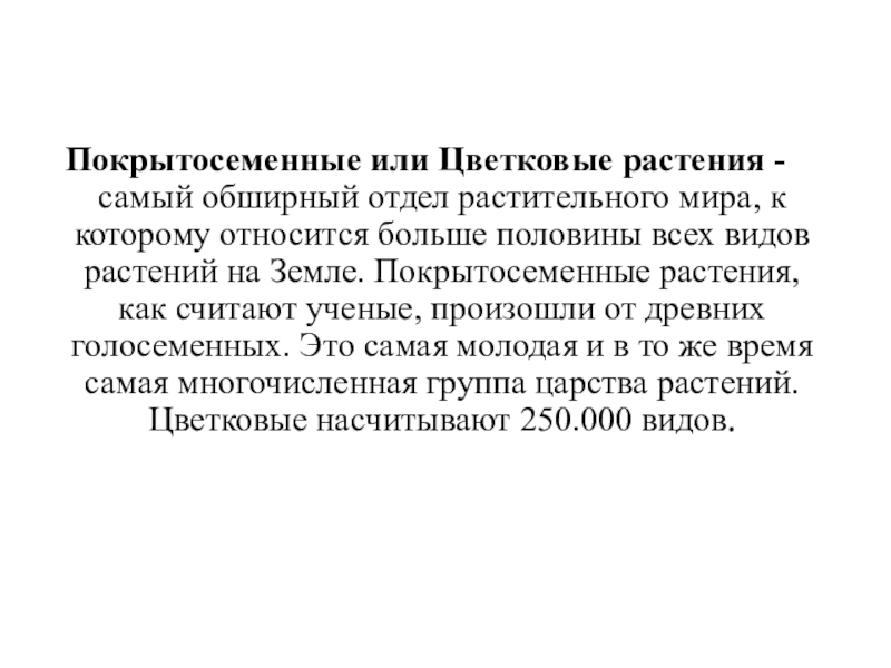 которому относится больше половины всех видов растений на Земле. Покрытосеменные растения,как считают ученые, произошли от древних голосеменных. Это самая молодая и в то же время самая многочисленная группа царства растений. Цветковые насчитывают 250.000 видов.