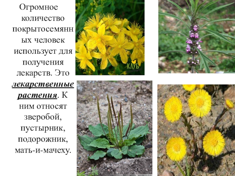 Огромное количество покрытосемянных человек использует для получения лекарств. Это лекарственные растения. К ним относят зверобой, пустырник, подорожник,