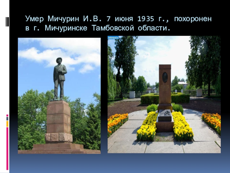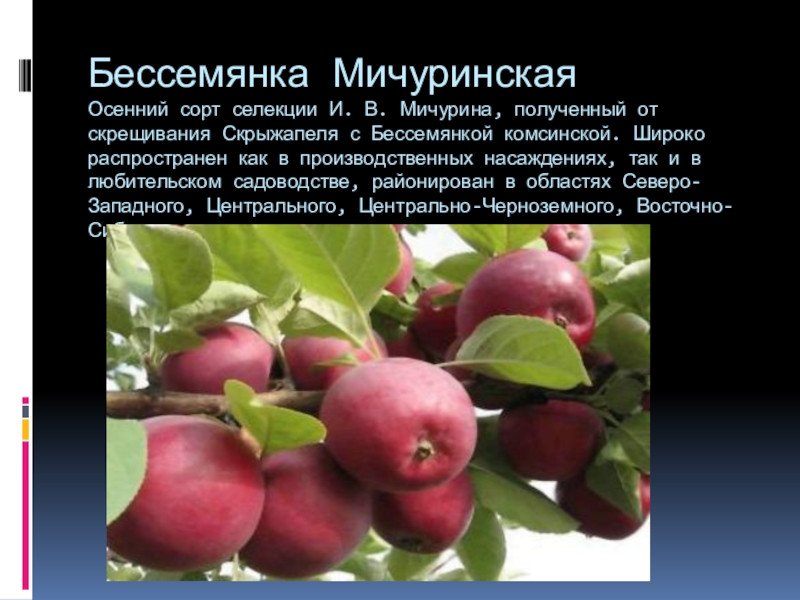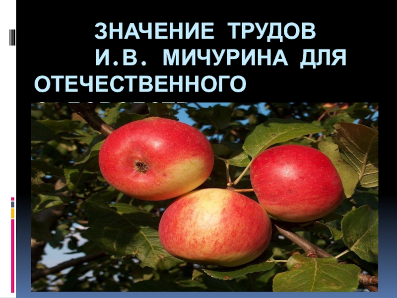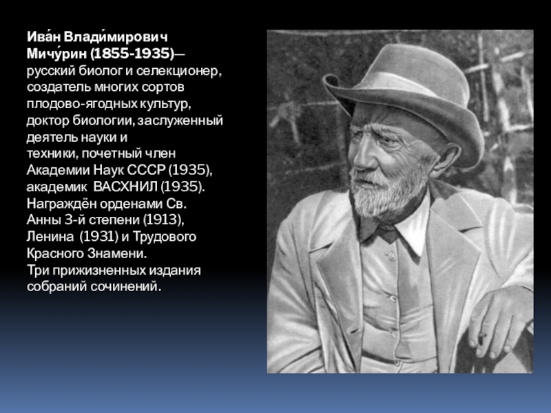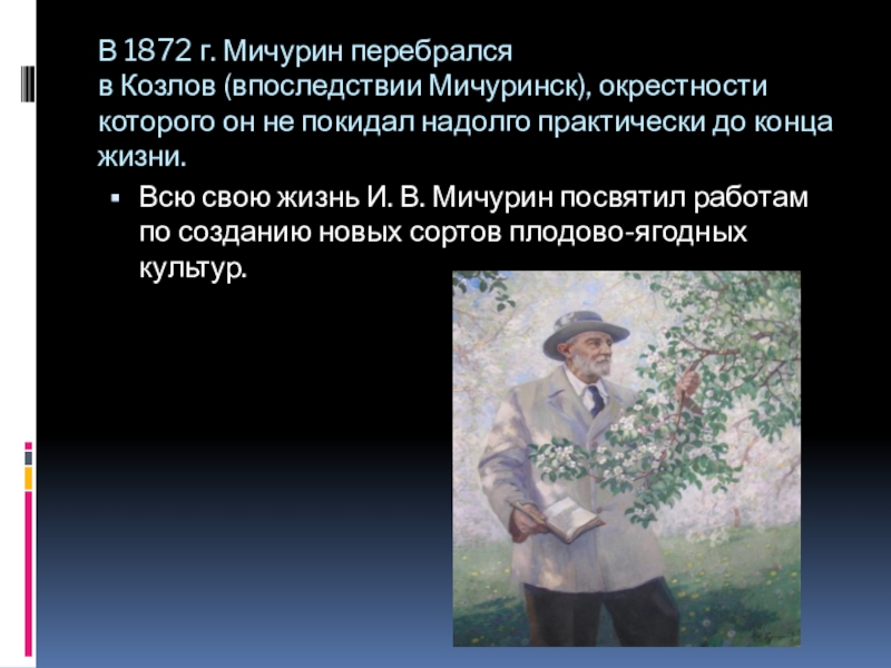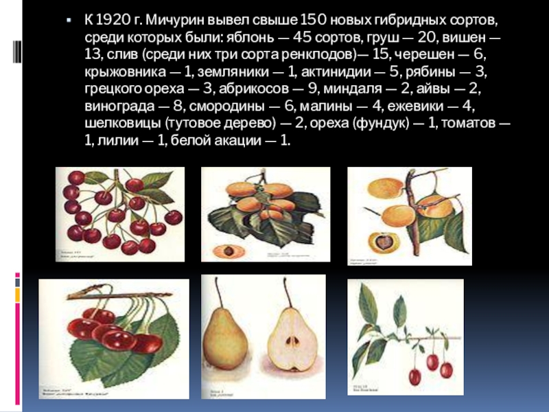Всю свою жизнь И. В. Мичурин посвятил работам по созданию новых сортов плодово-ягодных культур.