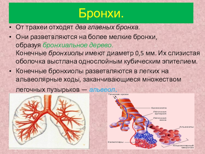 образуя бронхиальное дерево. Конечные бронхиолы имеют диаметр 0,5 мм. Их слизистая оболочка выстлана однослойным кубическим эпителием.