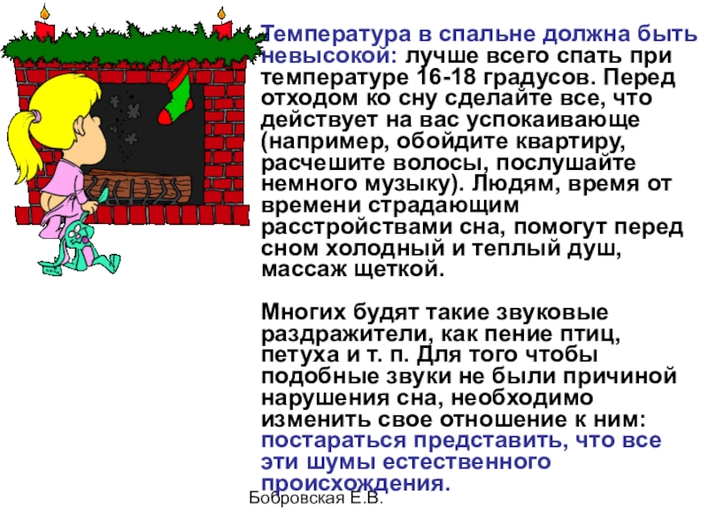 температуре 16-18 градусов. Перед отходом ко сну сделайте все, что действует на вас успокаивающе (например, обойдите квартиру, расчешите волосы, послушайте немного музыку). Людям, время от времени страдающим расстройствами сна, помогут перед сном холодный и теплый душ, массаж щеткой.