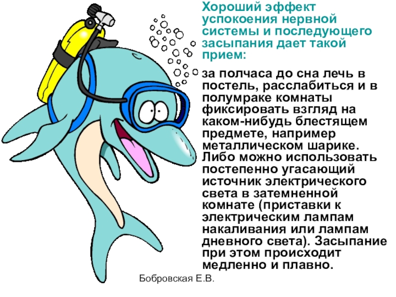 за полчаса до сна лечь в постель, расслабиться и в полумраке комнаты фиксировать взгляд на каком-нибудь блестящем предмете, например металлическом шарике. Либо можно использовать постепенно угасающий источник электрического света в затемненной комнате (приставки к электрическим лампам накаливания или лампам дневного света). Засыпание при этом происходит медленно и плавно.