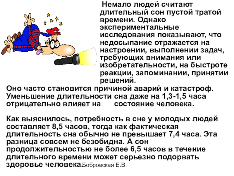 Оно часто становится причиной аварий и катастроф. Уменьшение длительности сна даже на 1,3-1,5 часа отрицательно влияет на состояние человека.