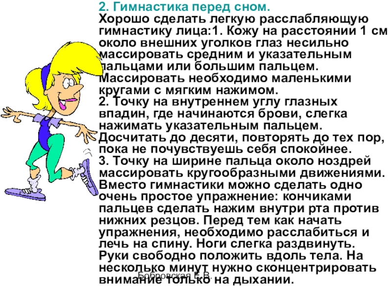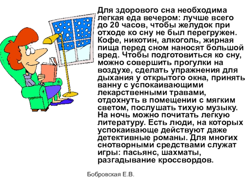20 часов, чтобы желудок при отходе ко сну не был перегружен. Кофе, никотин, алкоголь, жирная пища перед сном наносят большой вред. Чтобы подготовиться ко сну, можно совершить прогулки на воздухе, сделать упражнения для дыхания у открытого окна, принять ванну с успокаивающими лекарственными травами, отдохнуть в помещении с мягким светом, послушать тихую музыку. На ночь можно почитать легкую литературу. Есть люди, на которых успокаивающе действуют даже детективные романы. Для многих снотворными средствами служат игры: пасьянс, шахматы, разгадывание кроссвордов.