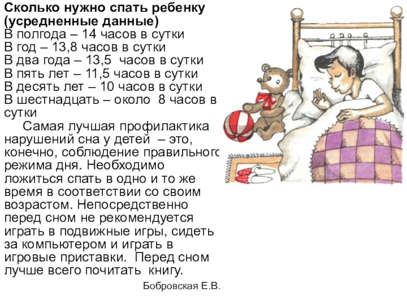Самая лучшая профилактика нарушений сна у детей – это, конечно, соблюдение правильного режима дня. Необходимо ложиться спать в одно и то же время в соответствии со своим возрастом. Непосредственно перед сном не рекомендуется играть в подвижные игры, сидеть за компьютером и играть в игровые приставки. Перед сном лучше всего почитать книгу.