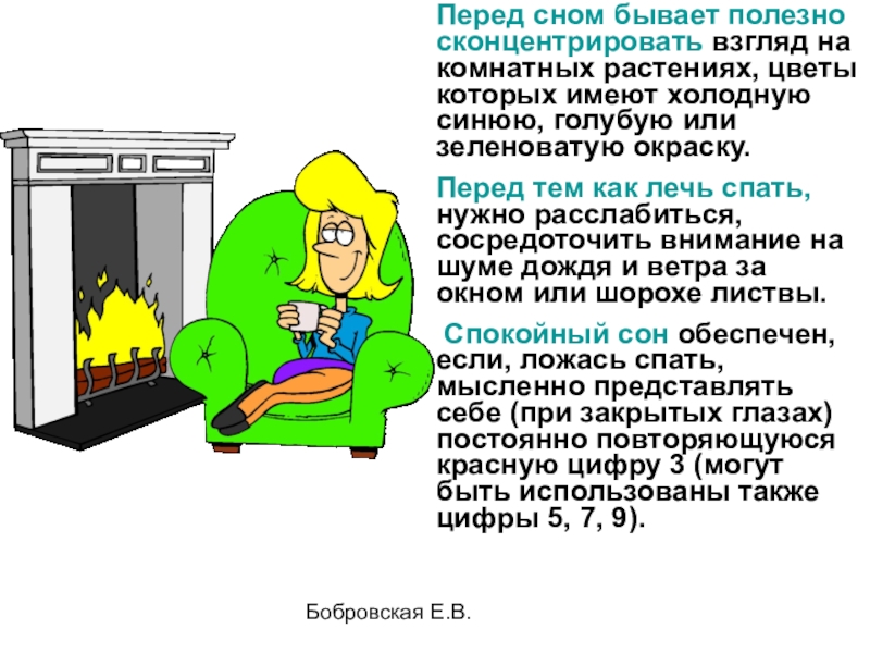 Перед тем как лечь спать, нужно расслабиться, сосредоточить внимание на шуме дождя и ветра за окном или шорохе листвы.