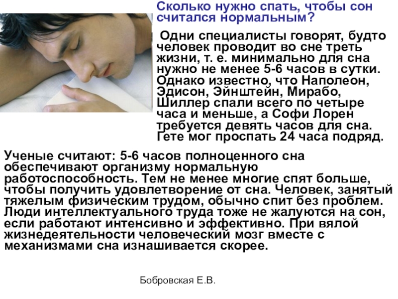 будто человек проводит во сне треть жизни, т. е. минимально для сна нужно не менее 5-6 часов в сутки. Однако известно, что Наполеон, Эдисон, Эйнштейн, Мирабо, Шиллер спали всего по четыре часа и меньше, а Софи Лорен требуется девять часов для сна. Гете мог проспать 24 часа подряд.