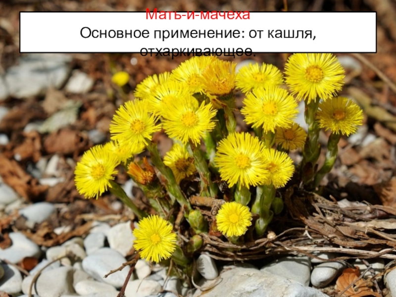 Слайд 9Мать-и-мачеха Основное применение: от кашля, отхаркивающее.
